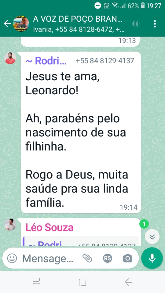Na troca de mensagens em um grupo da cidade Léo Souza , rebate as felicitações do Vereador Rodrigo Lucas , pelo nascimento da sua filha .