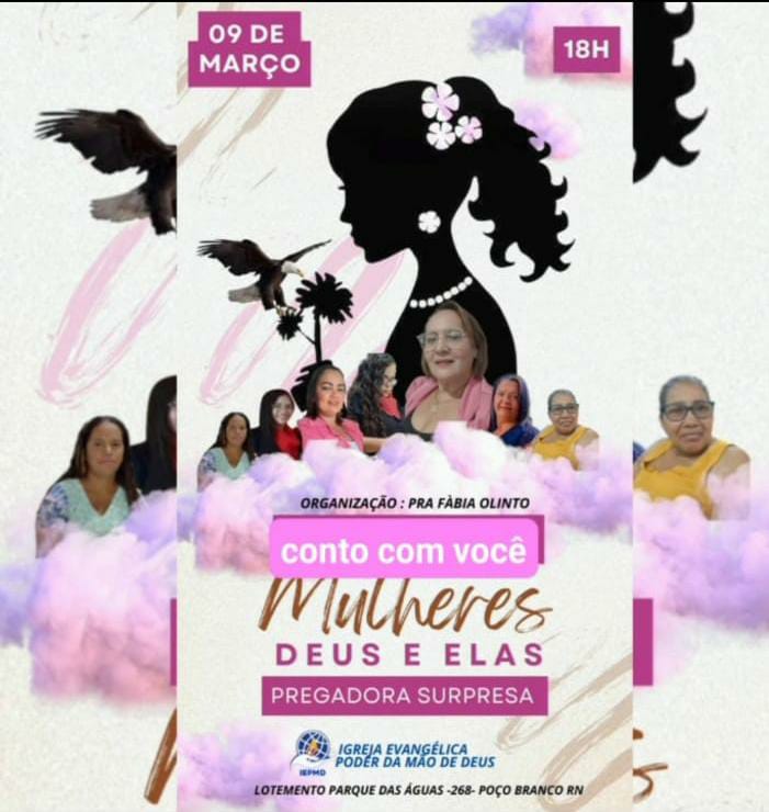 Neste sábado (09), a partir das 19:00 , a Igreja Evangélica O Poder da Mão de Deus , através da Pastora Fábia Olinto , realizará a primeira conferência de Mulheres do município de Poço Branco, com o tema Deus e Elas e contará com presenças de missionárias, pregadoras e pastora de várias cidades da Região do Mato Grande do Estado .