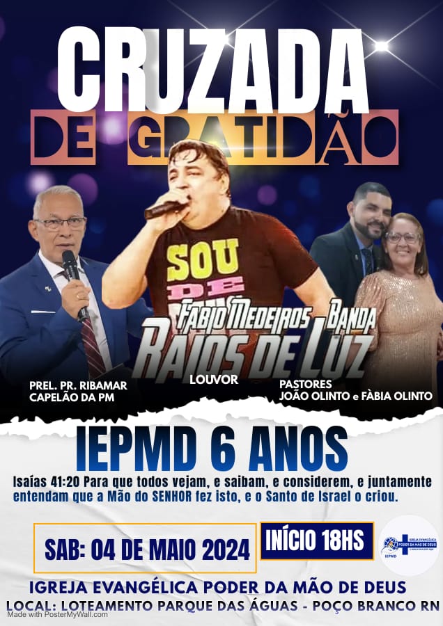 A Igreja Evangélica Poder da Mão de Deus do município de Poço Branco , realizará no dia 4 de maio , uma grande Cruzada da Gratidão em decorrência dos seus seis anos de existência.