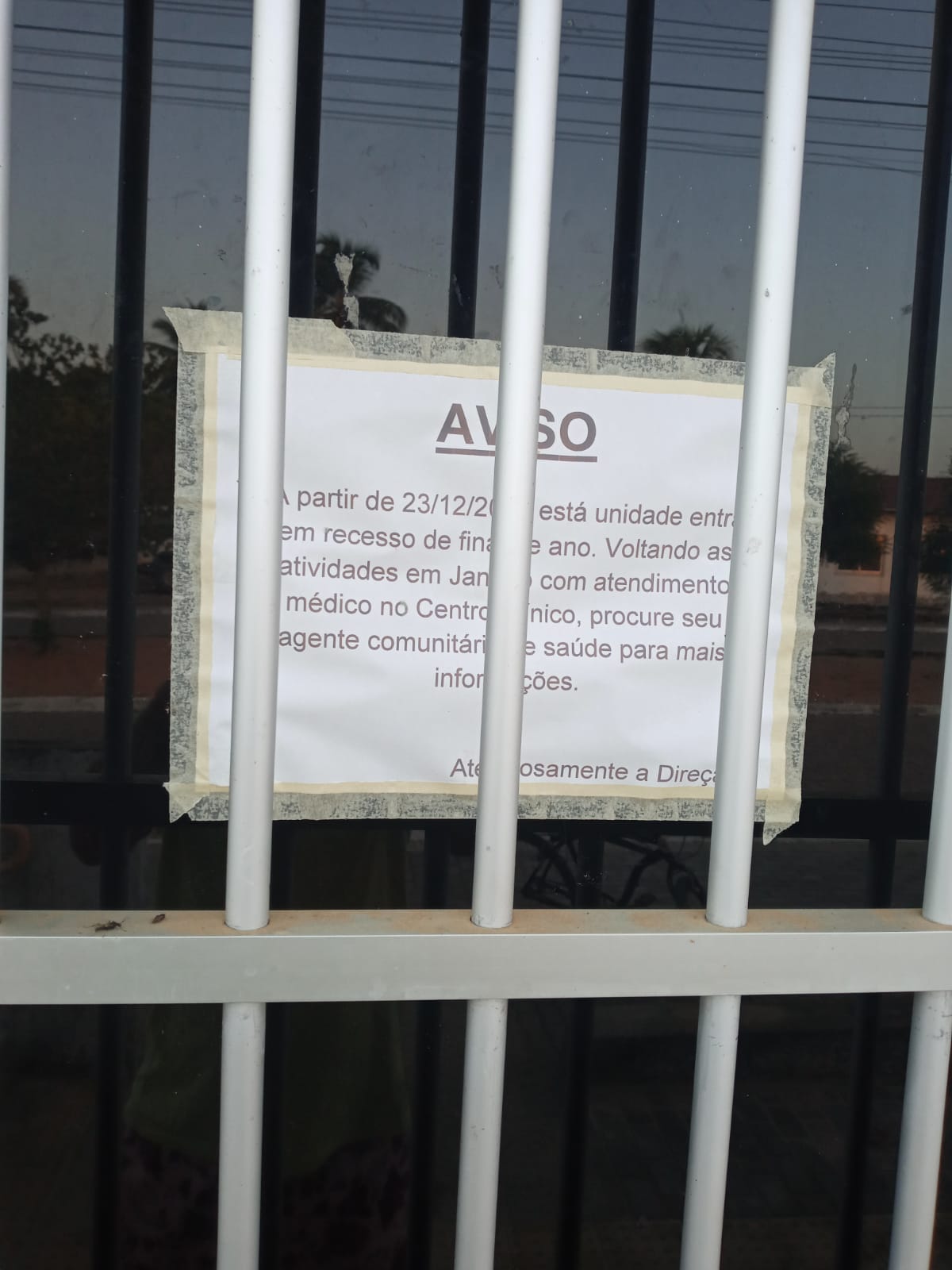 Na unidade Básica 01 , 02 , o comunicado informa a data do início do recesso (23/12/25) , mas não informa a data do retorno de suas atividades , e isso têm tirado o sono da população que necessita de atendimento médico , especialmente aqueles que precisam renovar suas receitas de medicamentos de uso contínuo.