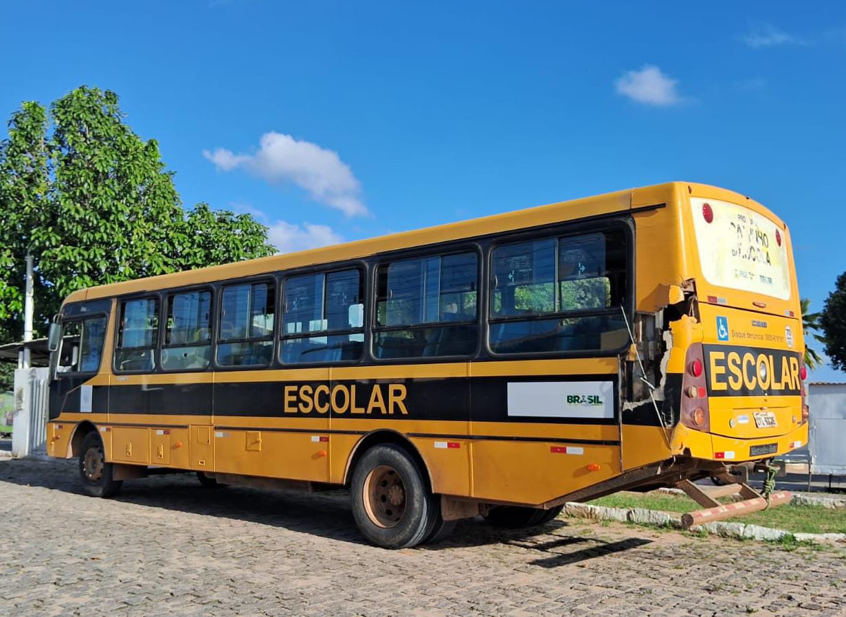 Parte da traseira do Ônibus Escolar Amarelinho , está com a sua lateral comprometida e o para choque amarrado a uma corda , o que têm causado preocupações aos pais e familiares dos alunos .