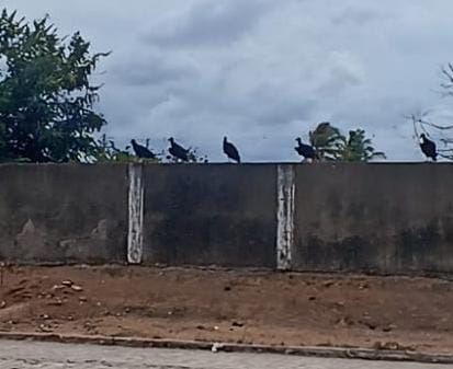 "Toda entrada de ano novo sofremos com a invasão dos urubus em Poço Branco , esses aí estão no muro da escola carnem costa , mas têm muitos disputando lixos nas ruas e calçadas da cidade" .